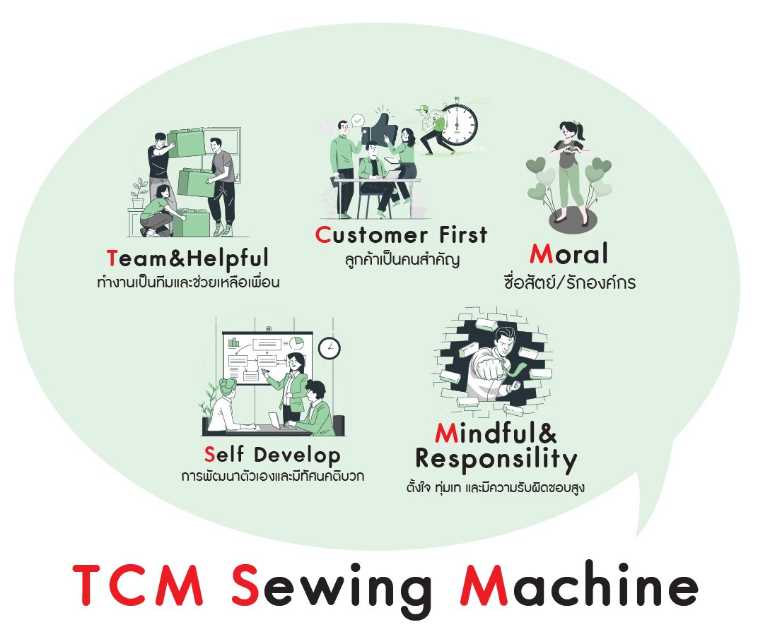 ตลอดระยะเวลาที่ผ่านมา ทีซีเอ็ม ได้พัฒนาเพิ่มความหลากหลายของสินค้า และบริการให้เข้ากับความต้องการในธุรกิจการ์เม้นท์ด้วยบุคลากรที่มี ความรู้ความสามารถและพันธมิตรทางธุรกิจที่มีประสบการณ์ตลอดจนเทคโนโลยีที่ทันสมัยโดย ทีซีเอ็ม มุ่งมั่นให้สินค้าและบริการ ที่มีคุณภาพและความพึงพอใจสูงสุดแก่ลูกค้าด้วยความซื่อสัตย์จริงใจตลอดมา จนกระทั่งปัจจุบันได้รับความไว้วางใจจากร้านค้าทั่วภูมิภาคและบริษัทการ์เม้นท์ชั้นนำต่างๆ ของประเทศไทย