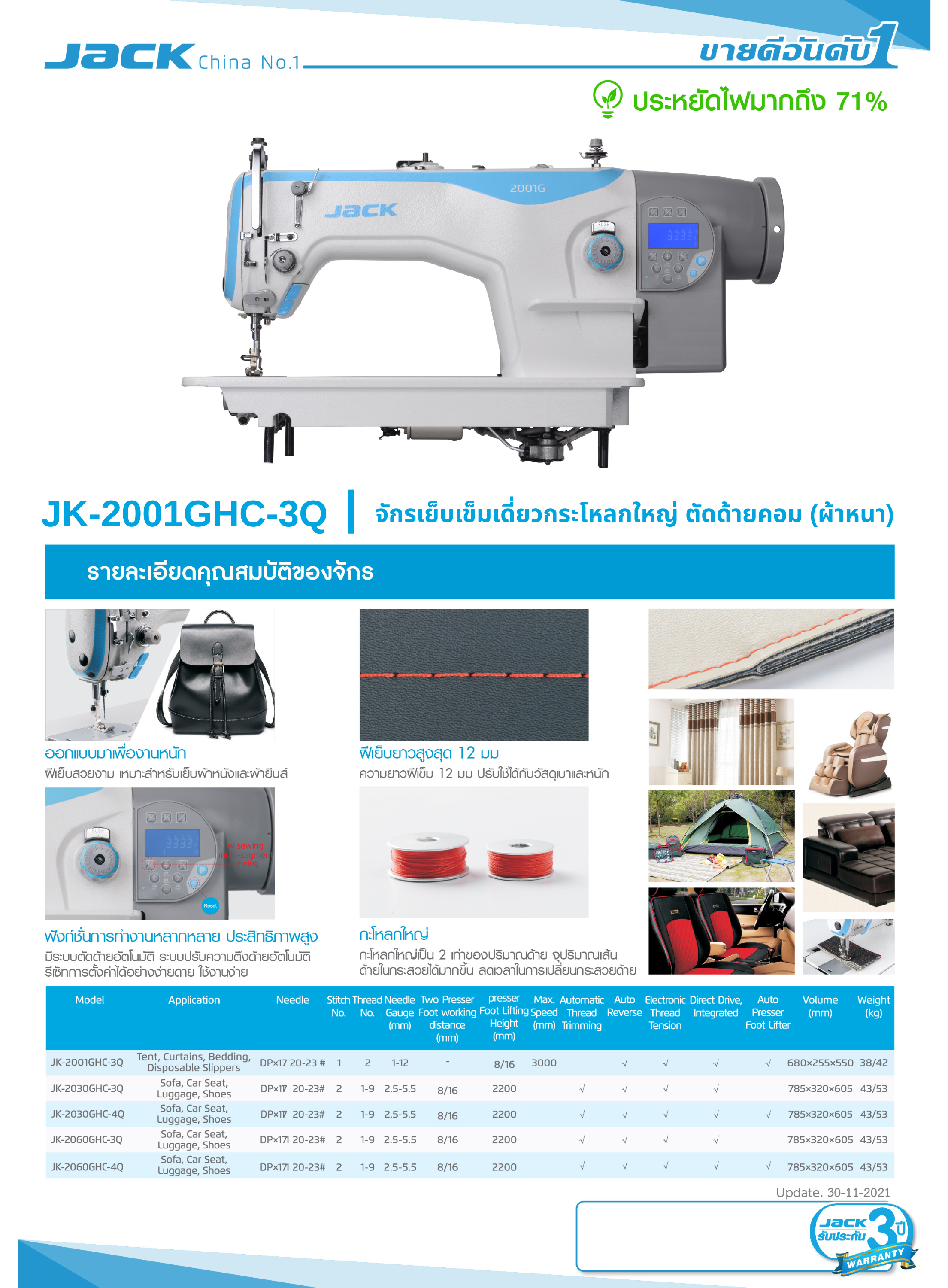 จักรเย็บเข็มเดี่ยวกระโหลกใหญ่ตัดด้ายคอม JACK รุ่น JK-2001GHC-3Q