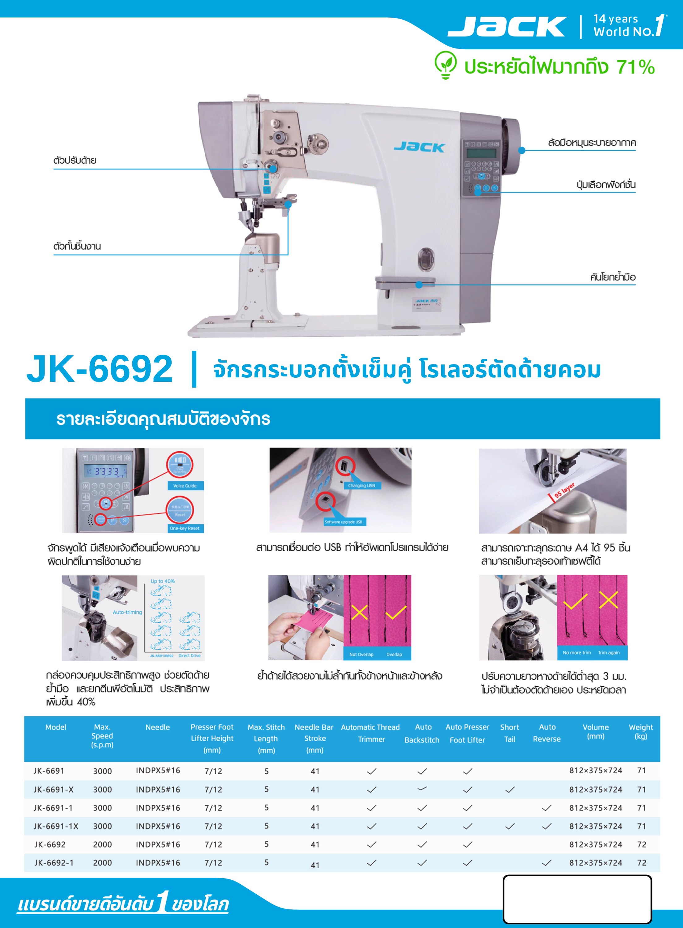 จักรกระบอกตั้งเข็มคู่โรเลอร์ตัดด้ายคอม JACK รุ่น JK-6692