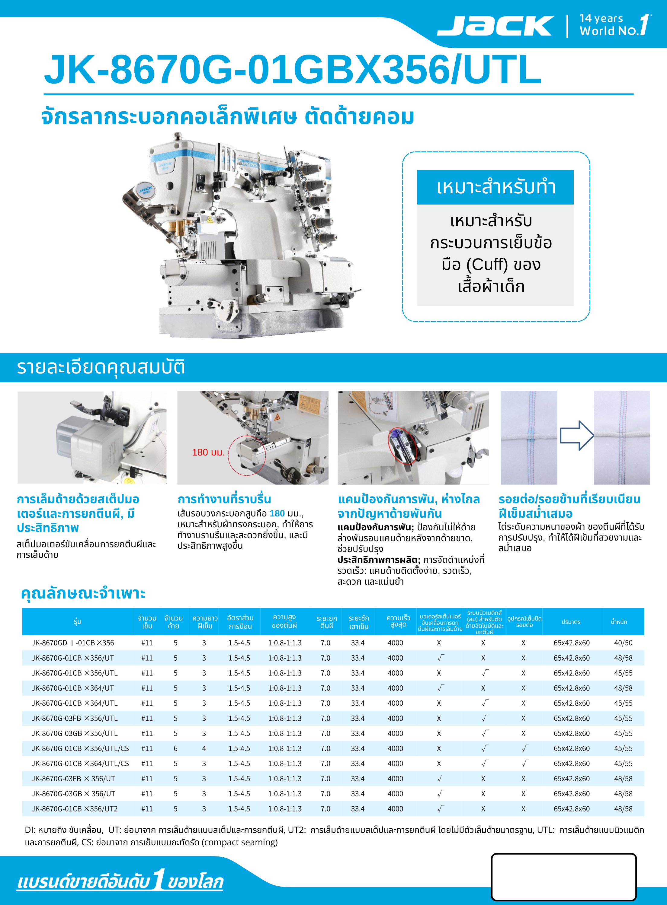 จักรลากระบอกคอเล็กพิเศษ ตัดด้ายคอม JACK รุ่น JK-8670G-01GBX356/UTL