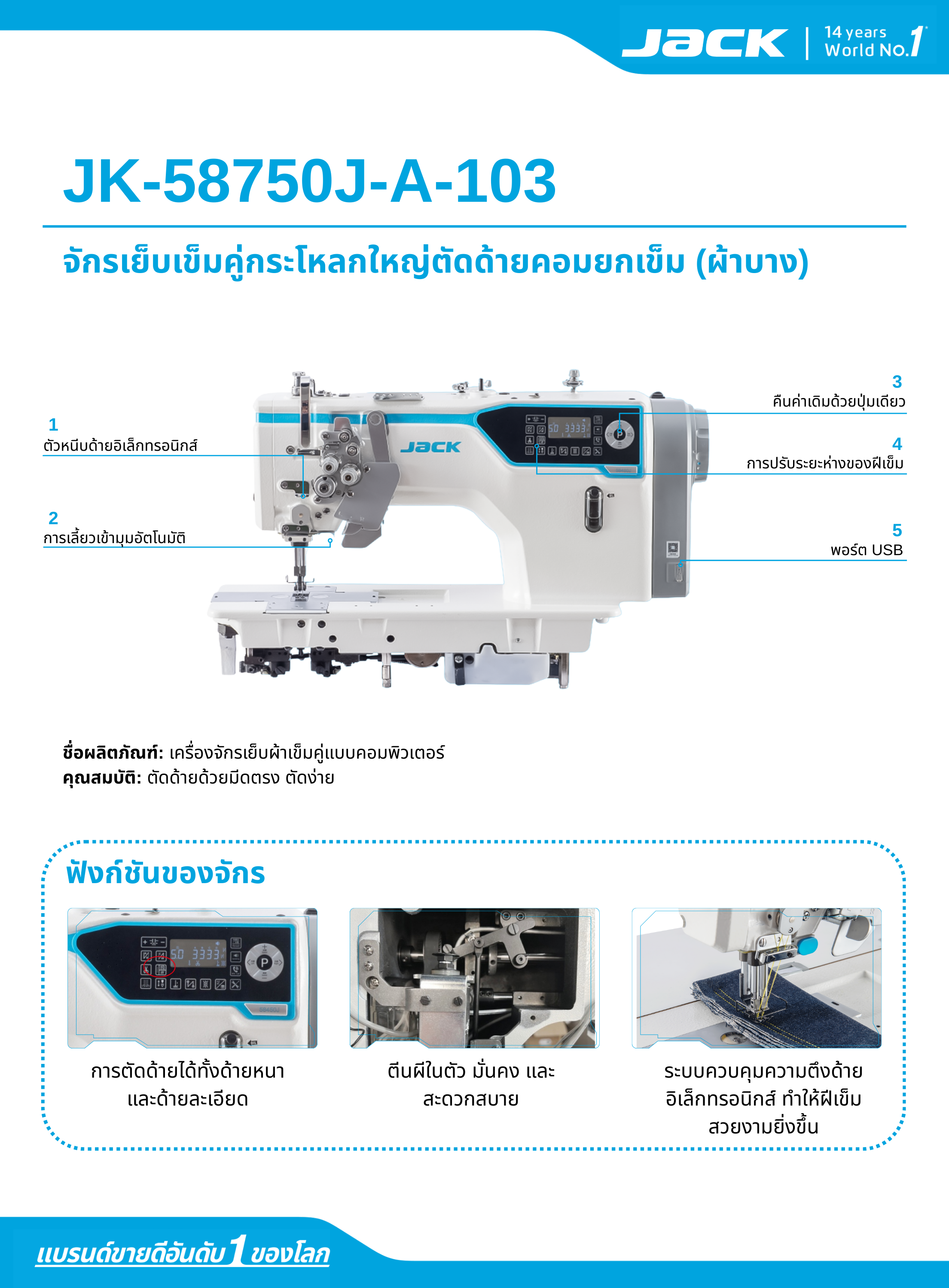 จักรเย็บเข็มคู่กระโหลกใหญ่ตัดด้ายคอม ยกเข็ม (ผ้าบาง) JACK รุ่น JK-58750J-A-103